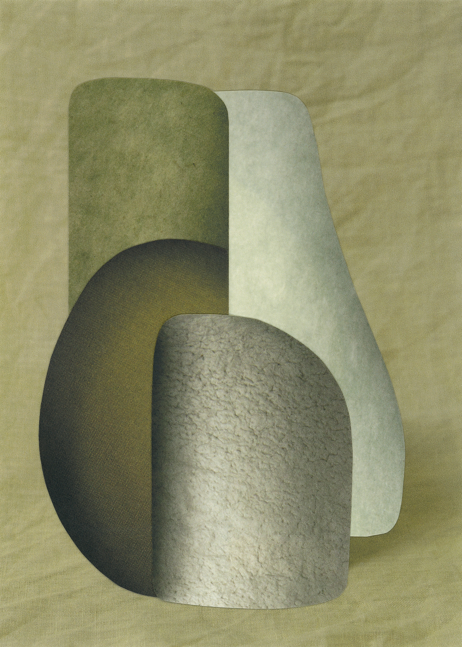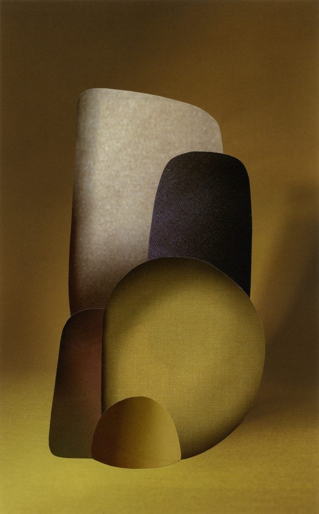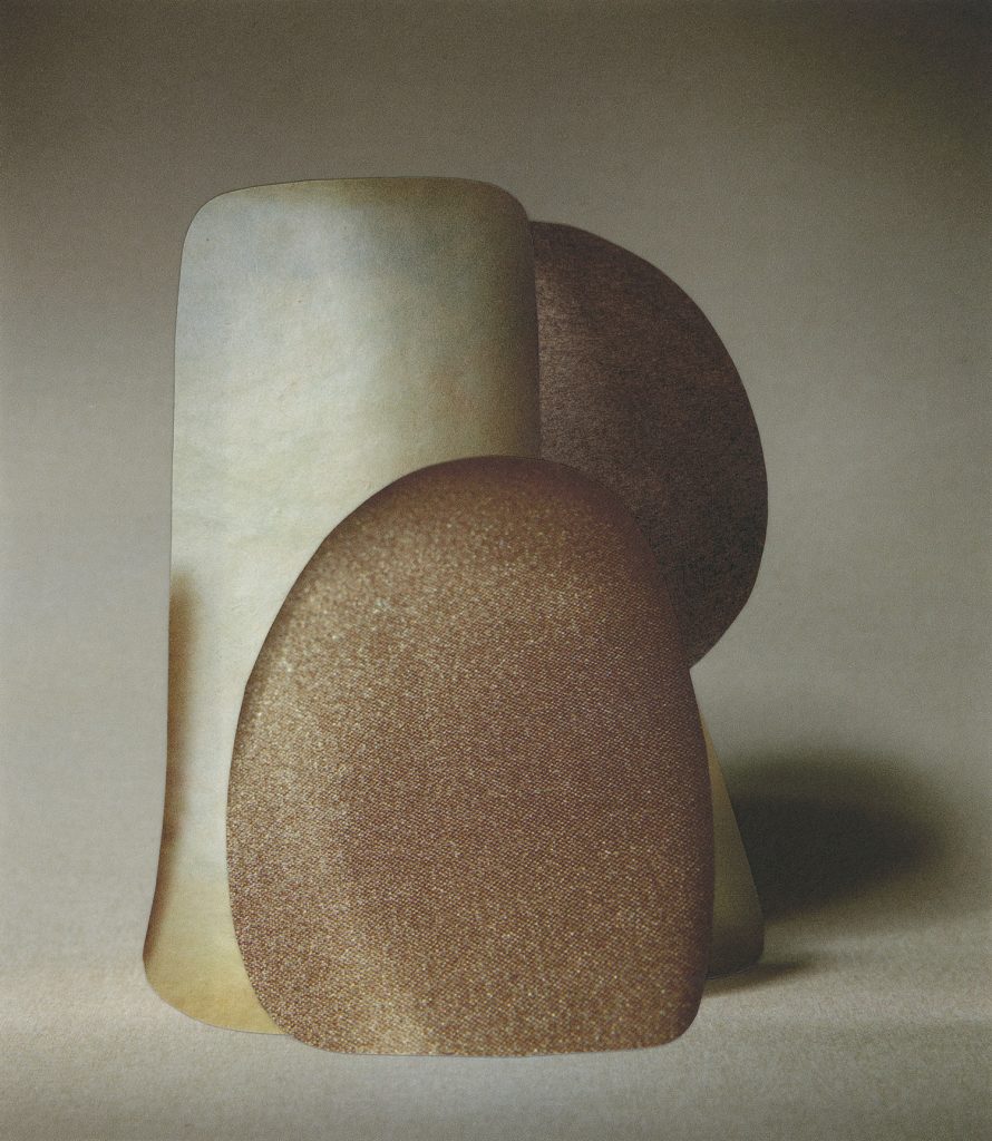 Hughes’s practice involves strategies of fragmentation and reconstruction. Her two- dimensional collages are often described as either flat sculptures or sculptural photographs. The shapes in the collages originate from outside edges and negative areas surrounding figures and objects, which have evolved into an ongoing regenerative alphabet of forms. She uses materials that invite the memory of everyday touch, such as paper stocks used in glossy magazines, pulp packaging, and clay. This focus on tactility positions the work in relation to the boundaries of the body, and the spaces created where bodies intersect with their surroundings. She examines edges within the photographic image, capturing movement through internal layers and seams. For example, In her most recent series of two-part C-Type collages, one form intersects the surface of another creating a visible border within the photograph, which can be viewed fully from the side.
