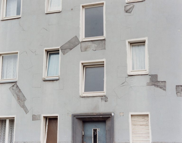 Joachim Brohm’s work from this period crystallises an approach that merges colour documentary photography with a cool, analytic detachment. His images of suburban houses, parking lots, industrial edges, and infrastructural voids resist traditional narrative cues; instead, they accumulate meaning through typological repetition and the understated tension between banality and latent cultural significance. Brohm’s palette – muted, softly diffused, and deliberately unromantic – serves the purpose of scrutiny rather than seduction. His framing is methodical, often positioning architectural fragments and modest landscapes in a way that emphasises patterns, provisional structures, and the evidentiary qualities of colour photography. Conceptually, Brohm’s project is one of mapping: the camera becomes a tool to catalogue the cultural logic embedded in post-industrial spaces, revealing how economic and social systems materialise in ordinary landscapes.